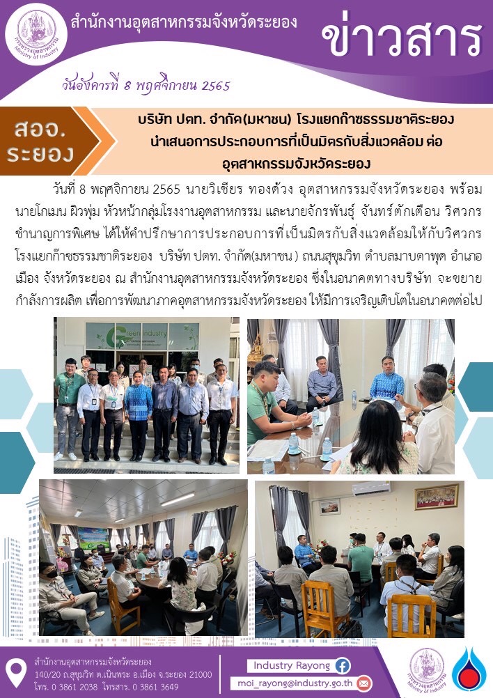วันที่ 8 พฤศจิกายน 2565 นายวิเชียร ทองด้วง อุตสาหกรรมจังหวัดระยอง พร้อม นายโกเมน ผิวพุ่ม หัวหน้ากลุ่มโรงงานอุตสาหกรรม และนายจักรพันธุ์ จันทร์ตักเตือน วิศวกรชำนาญการพิเศษ ได้ให้คำปรึกษาการประกอบการที่เป็นมิตรกับสิ่งแวดล้อมให้กับวิศวกร โรงแยกก๊าซธรรมชาติระยอง บริษัท ปตท. จำกัด(มหาชน ) ถนนสุขุมวิท ตำบลมาบตาพุด อำเภอเมือง จังหวัดระยอง ณ สำนักงานอุตสาหกรรมจังหวัดระยอง ซึ่งในอนาคตทางบริษัท จะขยายกำลังการผลิต เพื่อการพัฒนาภาคอุตสาหกรรมจังหวัดระยอง ให้มีการเจริญเติบโตในอนาคตต่อไป