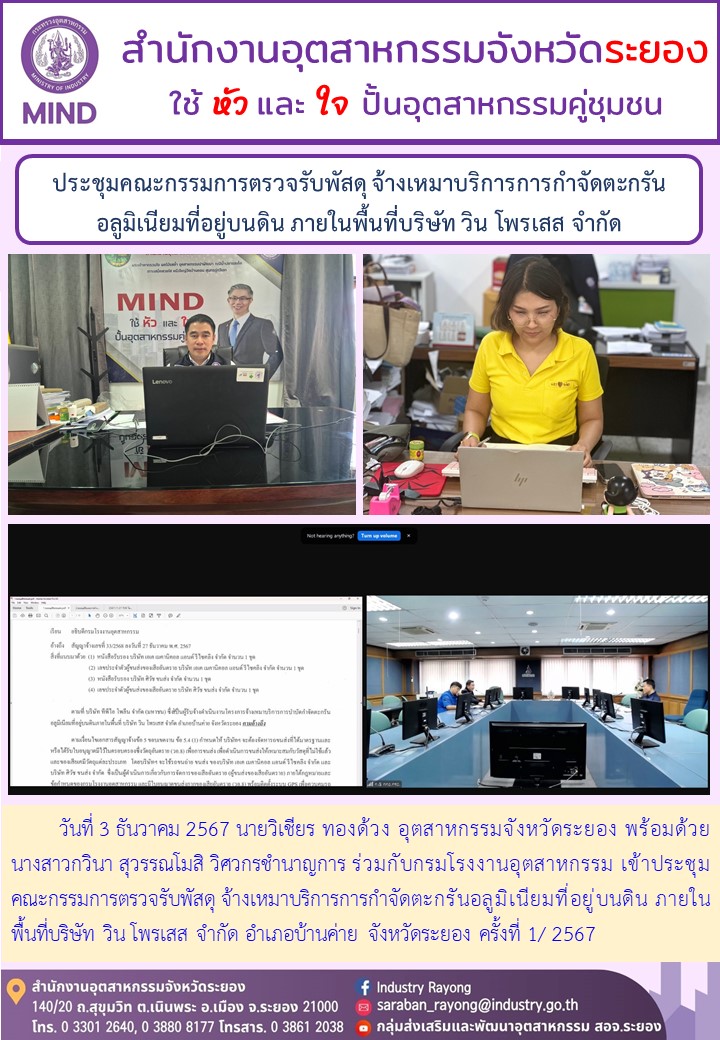 วันที่ 3 ธันวาคม 2567 นายวิเชียร ทองด้วง อุตสาหกรรมจังหวัดระยอง พร้อมด้วยนางสาวกวินา สุวรรณโมสิ วิศวกรชำนาญการ ร่วมกับกรมโรงงานอุตสาหกรรม เข้าประชุมคณะกรรมการตรวจรับพัสดุ จ้างเหมาบริการการกำจัดตะกรันอลูมิเนียมที่อยู่บนดิน ภายในพื้นที่บริษัท วิน โพรเสส จำกัด อำเภอบ้านค่าย จังหวัดระยอง ครั้งที่ 1/ 2567