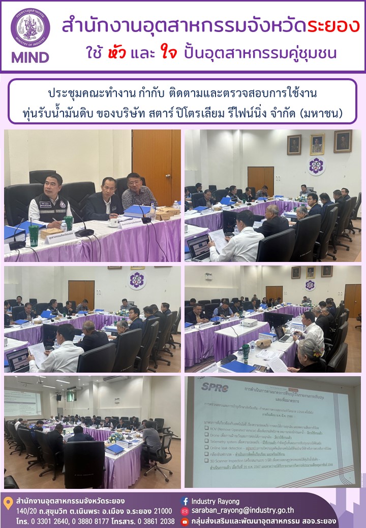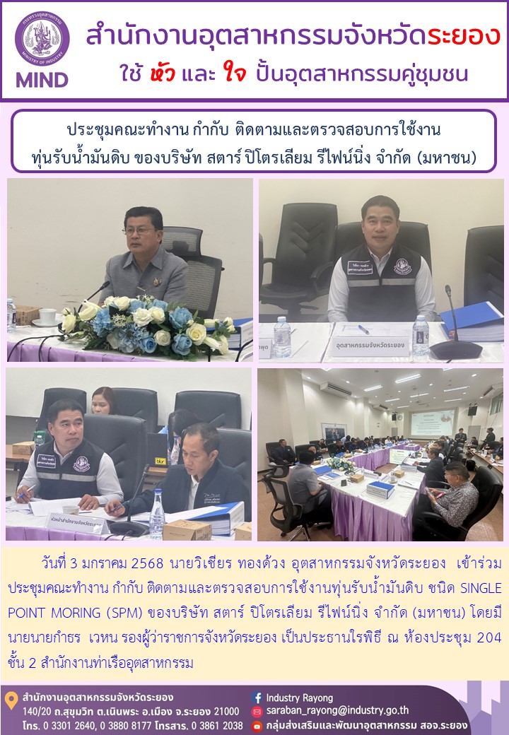 วันที่ 3 มกราคม 2568 นายวิเชียร ทองด้วง อุตสาหกรรมจังหวัดระยอง เข้าร่วมประชุมคณะทำงาน กำกับ ติดตามและตรวจสอบการใช้งานทุ่นรับน้ำมันดิบ ชนิด SINGLE POINT MORING (SPM) ของบริษัท สตาร์ ปิโตรเลียม รีไฟน์นิ่ง จำกัด (มหาชน) โดยมีนายนายกำธร เวหน รองผู้ว่าราชการจังหวัดระยอง เป็นประธานใรพิธี ณ ห้องประชุม 204 ชั้น 2 สำนักงานท่าเรืออุตสาหกรรม