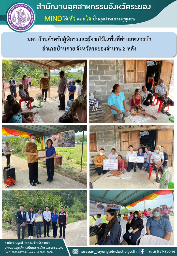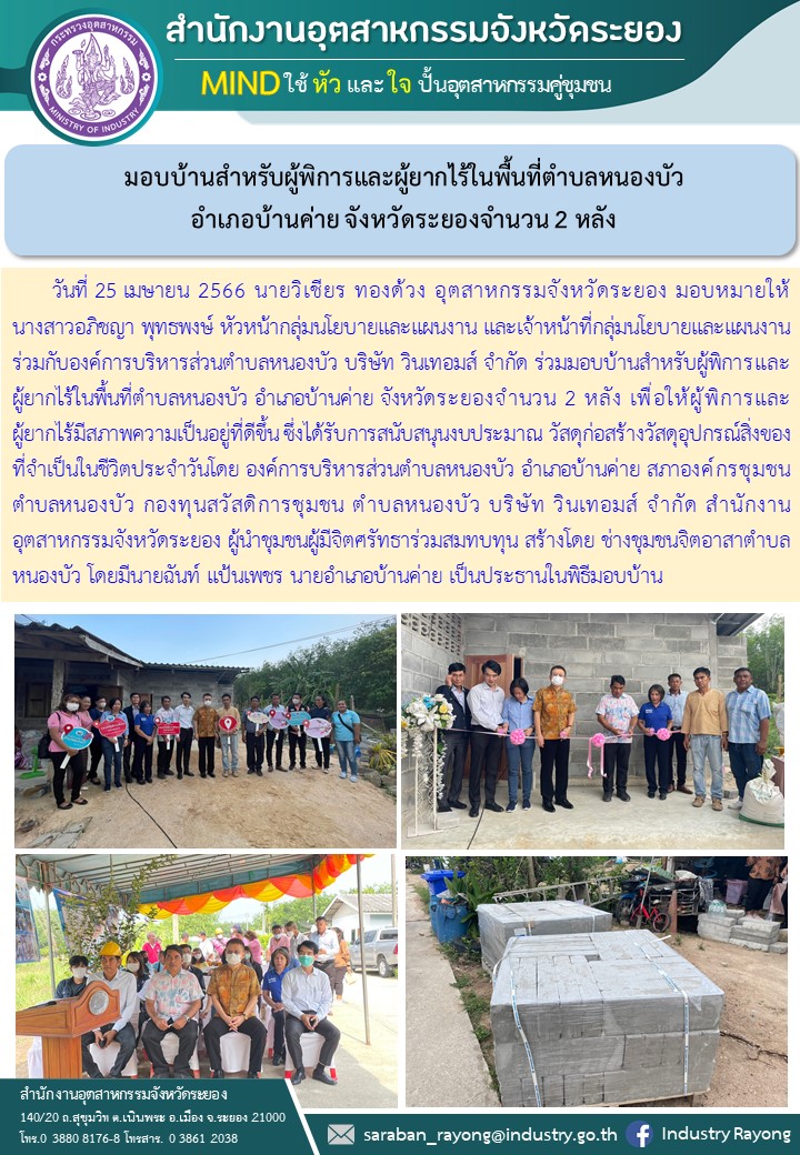 วันที่ 25 เมษายน 2566 นายวิเชียร ทองด้วง อุตสาหกรรมจังหวัดระยอง มอบหมายให้ นางสาวอภิชญา พุทธพงษ์ หัวหน้ากลุ่มนโยบายและแผนงาน และเจ้าหน้าที่กลุ่มนโยบายและแผนงานร่วมกับองค์การบริหารส่วนตำบลหนองบัว บริษัท วินเทอมส์ จำกัด ร่วมมอบบ้านสำหรับผู้พิการและ ผู้ยากไร้ในพื้นที่ตำบลหนองบัว อำเภอบ้านค่าย จังหวัดระยองจำนวน 2 หลัง เพื่อให้ผู้พิการและ ผู้ยากไร้มีสภาพความเป็นอยู่ที่ดีขึ้น ซึ่งได้รับการสนับสนุนงบประมาณ วัสดุก่อสร้างวัสดุอุปกรณ์สิ่งของที่จำเป็นในชีวิตประจำวันโดย องค์การบริหารส่วนตำบลหนองบัว อำเภอบ้านค่าย สภาองค์กรชุมชน ตำบลหนองบัว กองทุนสวัสดิการชุมชน ตำบลหนองบัว บริษัท วินเทอมส์ จำกัด สำนักงานอุตสาหกรรมจังหวัดระยอง ผู้นำชุมชนผู้มีจิตศรัทธาร่วมสมทบทุน สร้างโดย ช่างชุมชนจิตอาสาตำบลหนองบัว โดยมีนายฉันท์ แป้นเพชร นายอำเภอบ้านค่าย เป็นประธานในพิธีมอบบ้าน