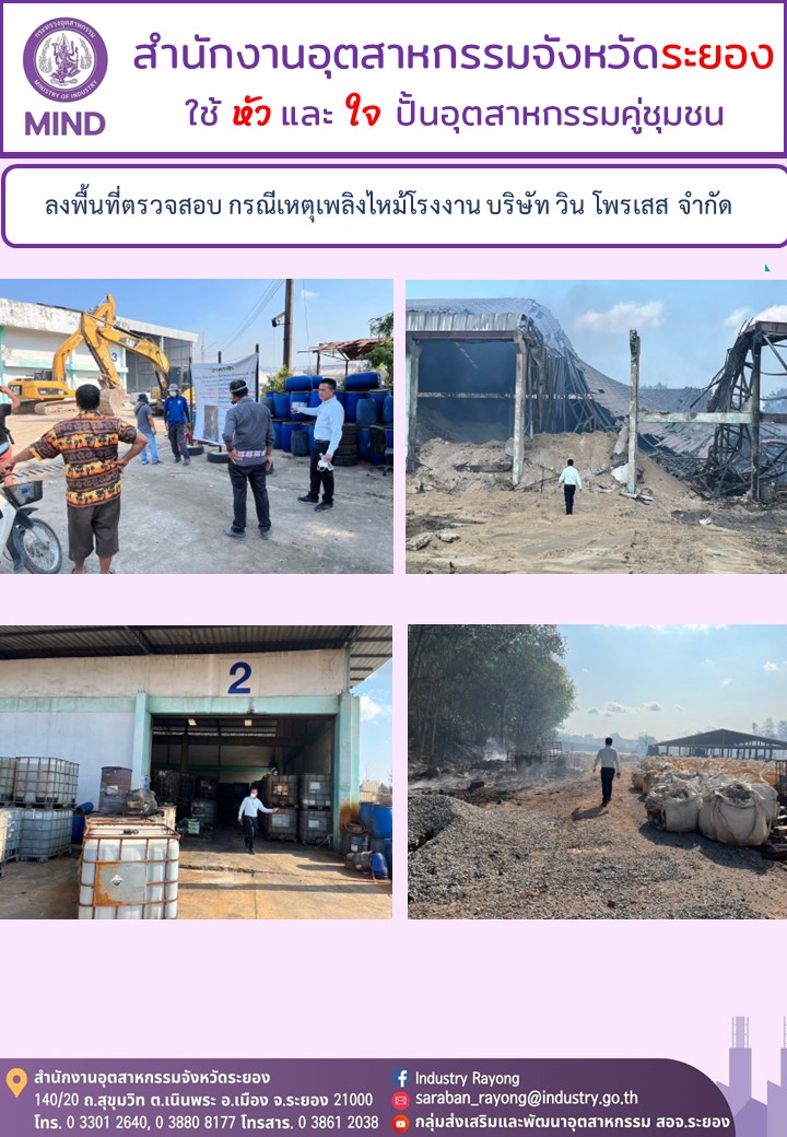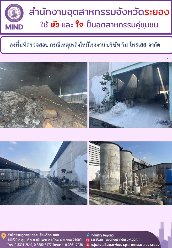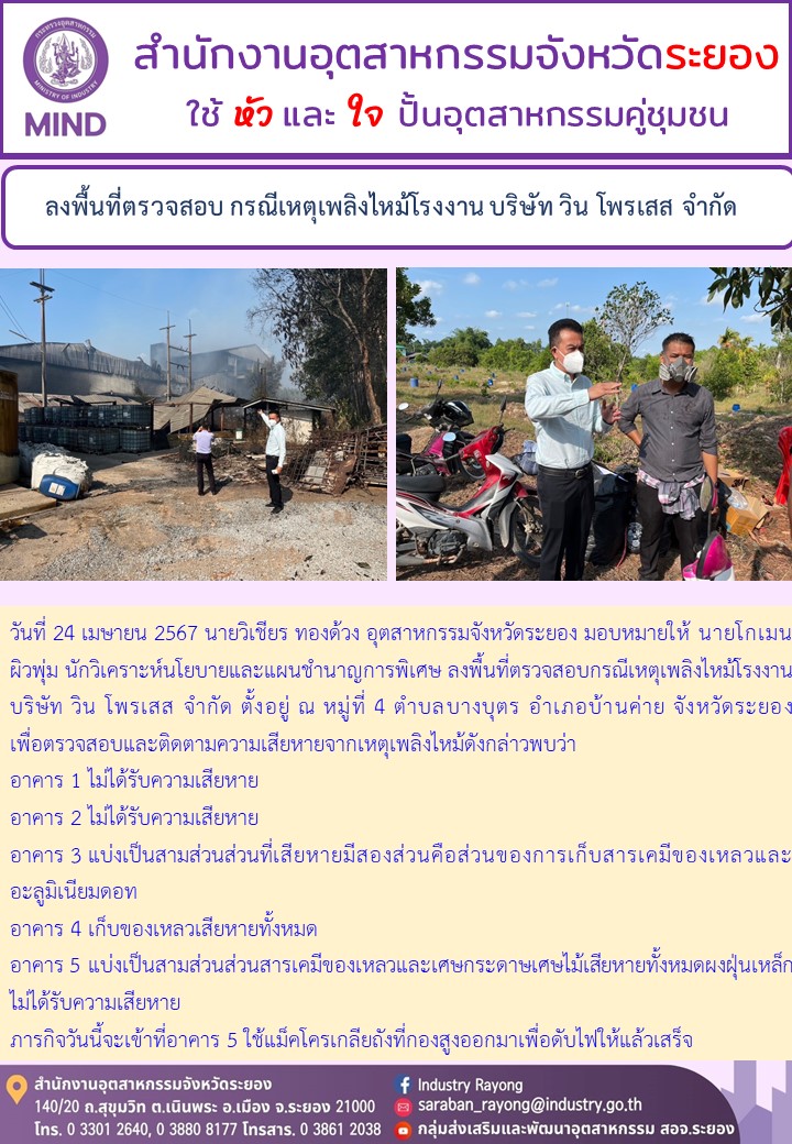 วันที่ 24 เมษายน 2567 นายวิเชียร ทองด้วง อุตสาหกรรมจังหวัดระยอง มอบหมายให้ นายโกเมน ผิวพุ่ม นักวิเคราะห์นโยบายและแผนชำนาญการพิเศษ ลงพื้นที่ตรวจสอบกรณีเหตุเพลิงไหม้โรงงานบริษัท วิน โพรเสส จำกัด ตั้งอยู่ ณ หมู่ที่ 4 ตำบลบางบุตร อำเภอบ้านค่าย จังหวัดระยอง เพื่อตรวจสอบและติดตามความเสียหายจากเหตุเพลิงไหม้ดังกล่าวพบว่า