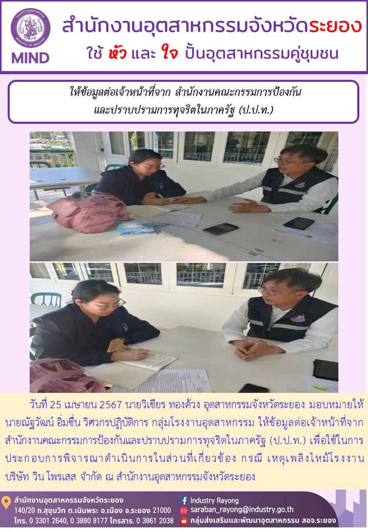 วันที่ 25 เมษายน 2567 นายวิเชียร ทองด้วง อุตสาหกรรมจังหวัดระยอง มอบหมายให้ นายณัฐวัฒน์ อิ่มชื่น วิศวกรปฏิบัติการ กลุ่มโรงงานอุตสาหกรรม ให้ข้อมูลต่อเจ้าหน้าที่จาก สำนักงานคณะกรรมการป้องกันและปราบปรามการทุจริตในภาครัฐ (ป.ป.ท.) เพื่อใช้ในการประกอบการพิจารณาดำเนินการในส่วนที่เกี่ยวข้อง กรณี เหตุเพลิงไหม้โรงงานบริษัท วิน โพรเสส จำกัด ณ สำนักงานอุตสาหกรรมจังหวัดระยอง