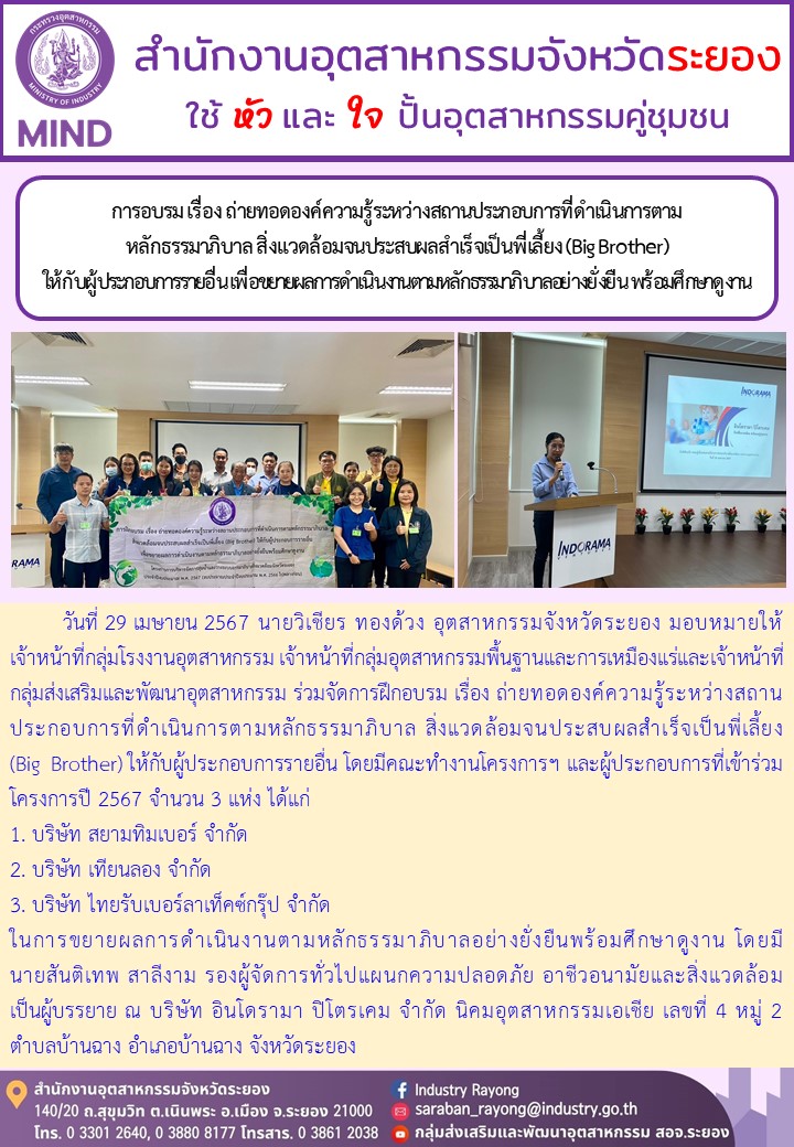 วันที่ 29 เมษายน 2567 นายวิเชียร ทองด้วง อุตสาหกรรมจังหวัดระยอง มอบหมายให้ เจ้าหน้าที่กลุ่มโรงงานอุตสาหกรรม เจ้าหน้าที่กลุ่มอุตสาหกรรมพื้นฐานและการเหมืองแร่และเจ้าหน้าที่กลุ่มส่งเสริมและพัฒนาอุตสาหกรรม ร่วมจัดการฝึกอบรม เรื่อง ถ่ายทอดองค์ความรู้ระหว่างสถานประกอบการที่ดำเนินการตามหลักธรรมาภิบาลสิ่งแวดล้อมจนประสบผลสำเร็จเป็นพี่เลี้ยง (Big Brother) ให้กับผู้ประกอบการรายอื่น โดยมีคณะทำงานโครงการฯ และผู้ประกอบการที่เข้าร่วมโครงการปี 2567 จำนวน 3 แห่ง ได้แก่