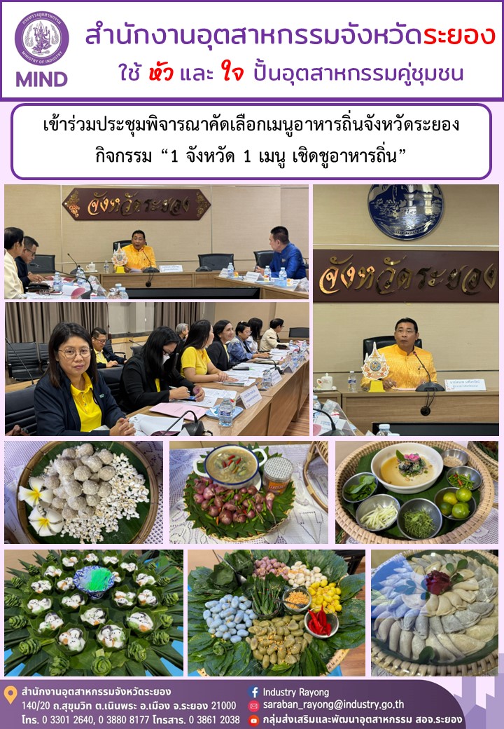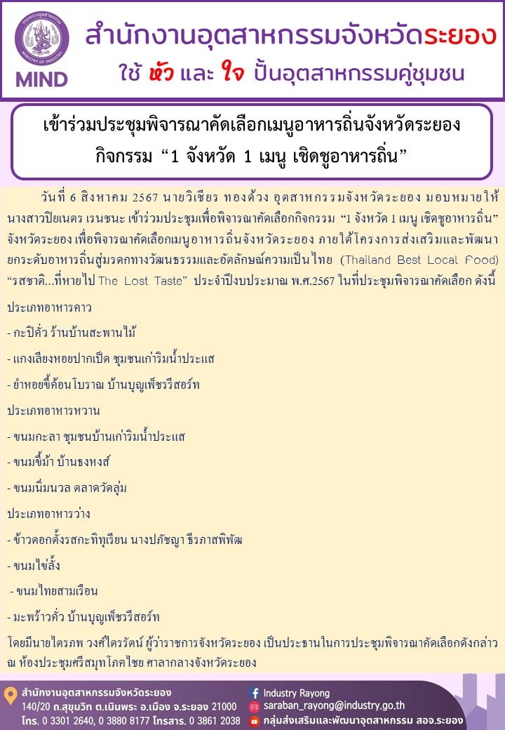 วันที่ 6 สิงหาคม 2567 นายวิเชียร ทองด้วง อุตสาหกรรมจังหวัดระยอง มอบหมายให้นางสาวปิยเนตร เรนชนะ เข้าร่วมประชุมเพื่อพิจารณาคัดเลือกกิจกรรม “1 จังหวัด 1 เมนู เชิดชูอาหารถิ่น” จังหวัดระยอง เพื่อพิจารณาคัดเลือกเมนูอาหารถิ่นจังหวัดระยอง ภายใต้โครงการส่งเสริมและพัฒนายกระดับอาหารถิ่นสู่มรดกทางวัฒนธรรมและอัตลักษณ์ความเป็นไทย (Thailand Best Local Food) “รสชาติ…ที่หายไป The Lost Taste” ประจำปีงบประมาณ พ.ศ.2567ในที่ประชุมพิจารณาคัดเลือก ดังนี้