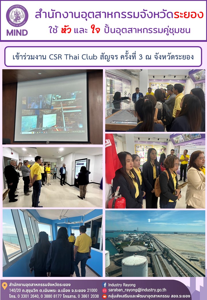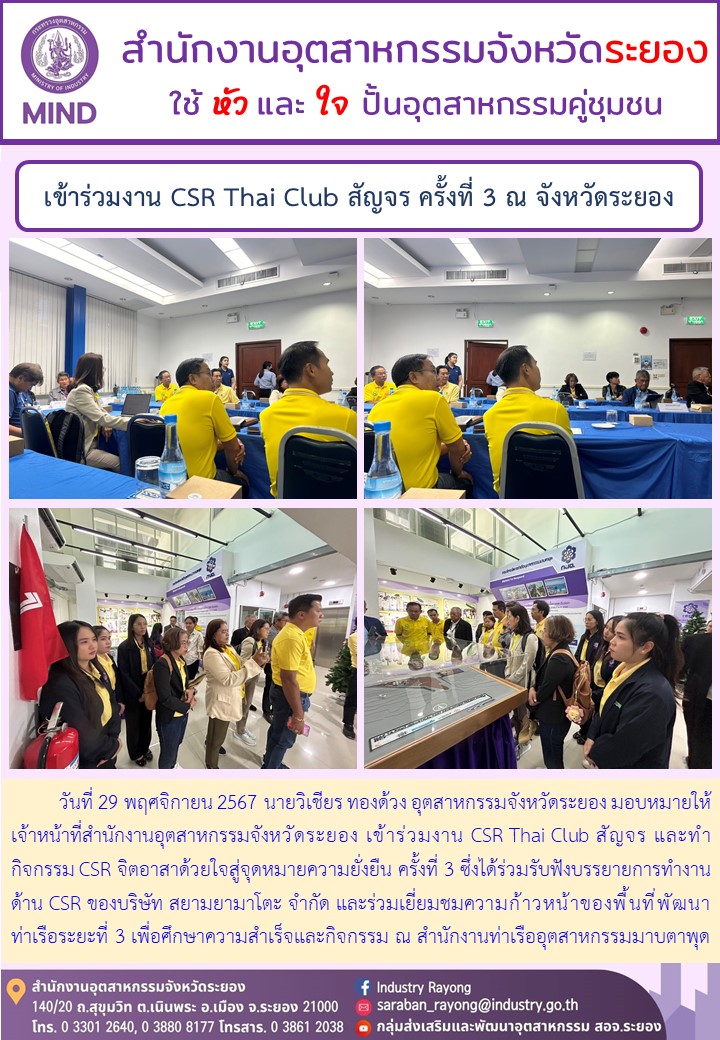 วันที่ 29 พฤศจิกายน 2567 นายวิเชียร ทองด้วง อุตสาหกรรมจังหวัดระยอง มอบหมายให้เจ้าหน้าที่สำนักงานอุตสาหกรรมจังหวัดระยอง เข้าร่วมงาน CSR Thai Club สัญจร และทำกิจกรรม CSR จิตอาสาด้วยใจสู่จุดหมายความยั่งยืน ครั้งที่ 3 ซึ่งได้ร่วมรับฟังบรรยายการทำงานด้าน CSR ของบริษัท สยามยามาโตะ จำกัด และร่วมเยี่ยมชมความก้าวหน้าของพื้นที่พัฒนาท่าเรือระยะที่ 3 เพื่อศึกษาความสำเร็จและกิจกรรม ณ สำนักงานท่าเรืออุตสาหกรรมมาบตาพุด